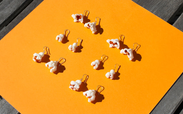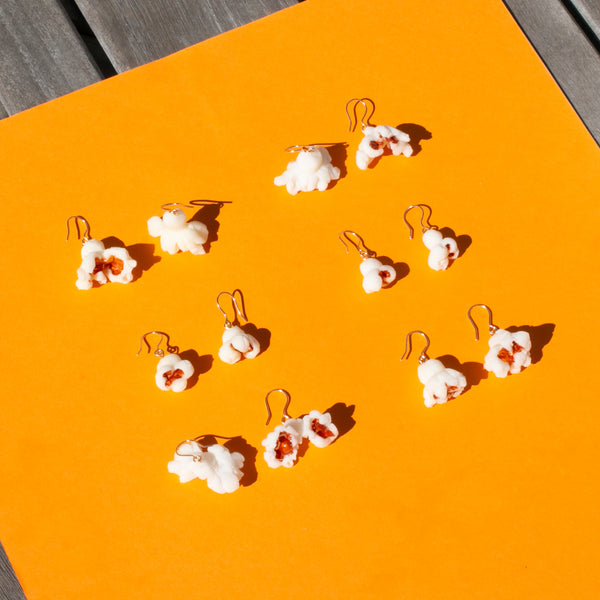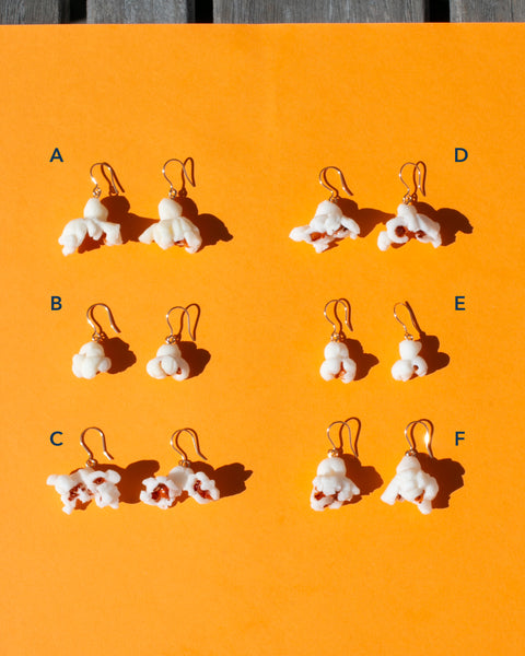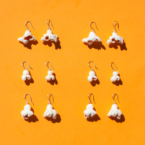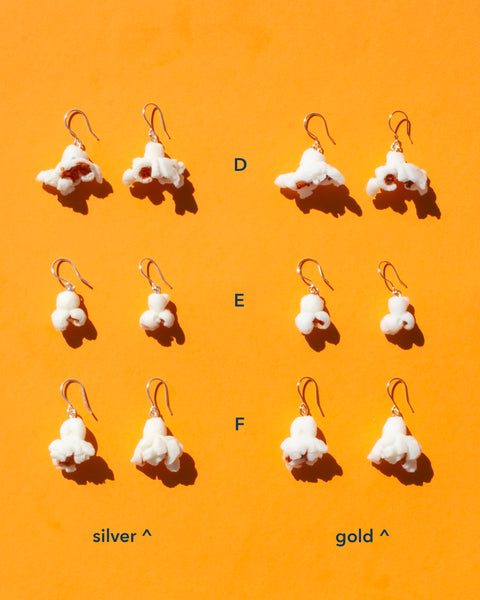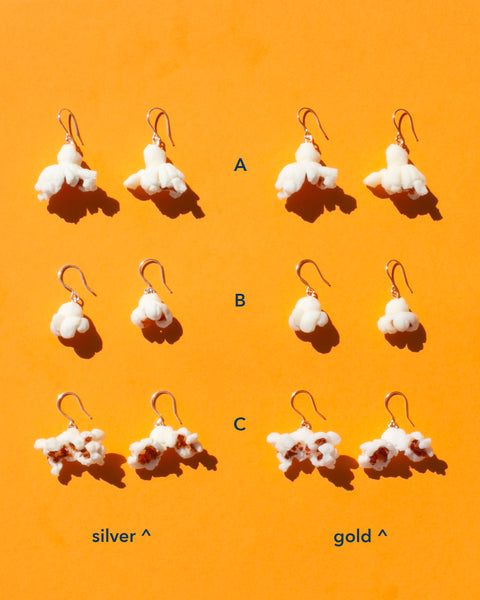 Each popcorn earring measures between 1.25 to 1.5 inches in length, including ear hook/ hoops. Hoops have a slightly shorter drop than ear hooks.